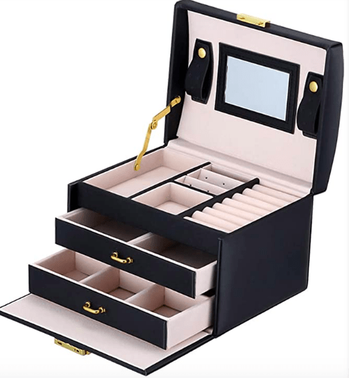 This jewellery box will keep everything organized and in one place. It also has a mirror inside the box that will allow her to see herself and what she is doing while putting on her favourite jewellery anytime, anywhere. It has a three-layer space; she can store anything in there like her rings, earrings, necklaces, bracelets and even watches.